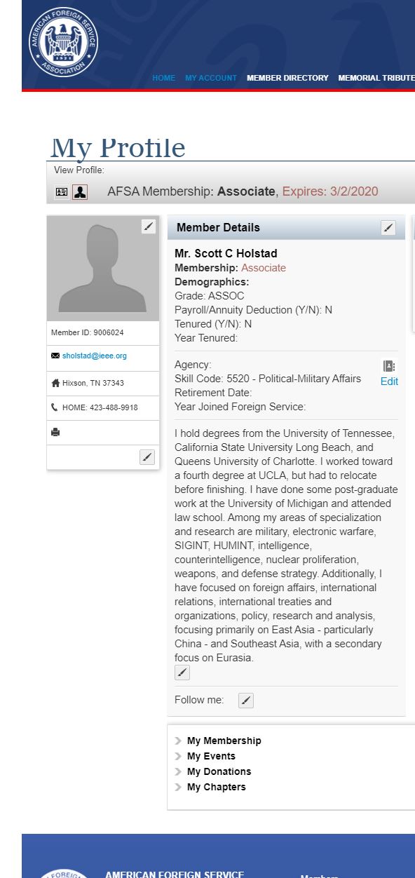American Foreign Service Association (AFSA) – Upper section of my profile on the organization’s website