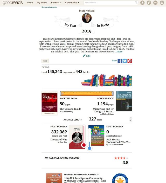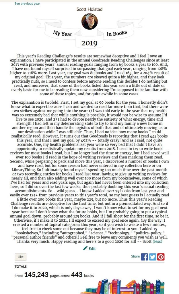 Every year, I participate in the Goodreads Annual Reading Challenge. At the beginning of each year, you set a goal for how many books you’ll read that year. Goodreads keeps track of your running total and then lets you know how you’ve done and what percentage of your goal you met. You can also see other participants in the Reading Challenge. Each year, they provide an end of year webpage showing your stats, how you did, etc. For some reason, they recently decided to make them only able to share to a few social network sites where I no longer have accounts. I remain annoyed by this, so I’m doing the next best thing for the second straight year. (And you can see my blog entry for 2018’s results here: My Year In Books: 2018.) I’ve taken several screenshots showing information like what they describe as your “Year in Books,” parts of the webpage showing how many books, pages, etc, you read that year, the average length of the book, etc., my 2019 Reading Challenge results, my Reading Challenge results since 2013 and something I’ve never done before — an intro to the webpage of My Year in Books because as you’ll see, my numbers are tremendously skewed up this year and are thus somewhat deceptive, so I felt obligated to explain. For what it’s worth, I set my 2019 reading goal at 90 books. Goodreads is reporting I read 443 books, or 492% of my original goal. Like I said, I wrote an explanation because while I exceed my goal every year, it’s never by that much and there are a couple of reasons why this year’s numbers aren’t completely accurate. So I’m going to post these screenshots for you to see. If you want to see the actual books I read this year, you can go to my Goodreads profile here. (I believe you have to be a logged in member to view it, however…)