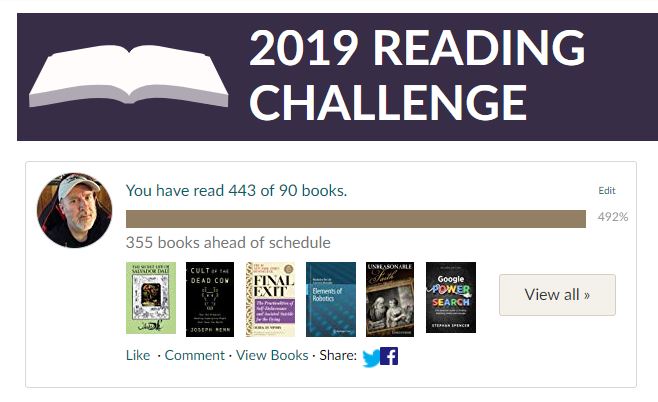Every year, I participate in the Goodreads Annual Reading Challenge. At the beginning of each year, you set a goal for how many books you’ll read that year. Goodreads keeps track of your running total and then lets you know how you’ve done and what percentage of your goal you met. You can also see other participants in the Reading Challenge. Each year, they provide an end of year webpage showing your stats, how you did, etc. For some reason, they recently decided to make them only able to share to a few social network sites where I no longer have accounts. I remain annoyed by this, so I’m doing the next best thing for the second straight year. (And you can see my blog entry for 2018’s results here: My Year In Books: 2018.) I’ve taken several screenshots showing information like what they describe as your “Year in Books,” parts of the webpage showing how many books, pages, etc, you read that year, the average length of the book, etc., my 2019 Reading Challenge results, my Reading Challenge results since 2013 and something I’ve never done before — an intro to the webpage of My Year in Books because as you’ll see, my numbers are tremendously skewed up this year and are thus somewhat deceptive, so I felt obligated to explain. For what it’s worth, I set my 2019 reading goal at 90 books. Goodreads is reporting I read 443 books, or 492% of my original goal. Like I said, I wrote an explanation because while I exceed my goal every year, it’s never by that much and there are a couple of reasons why this year’s numbers aren’t completely accurate. So I’m going to post these screenshots for you to see. If you want to see the actual books I read this year, you can go to my Goodreads profile here. (I believe you have to be a logged in member to view it, however…)