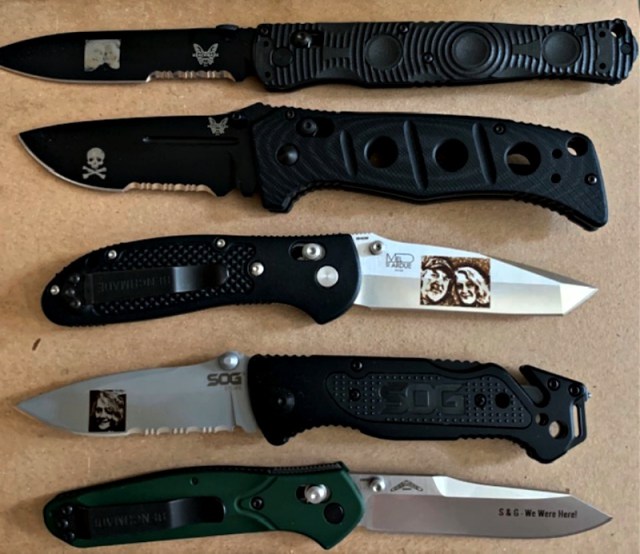 A few customized knives from our collection. Notice the etchings of us on the 1st (Benchmade SOCP Tactical stiletto) & 3rd (Benchmade Griptilian) as well as the one of Gretchen alone on the 4th (SOG Escape) knife.