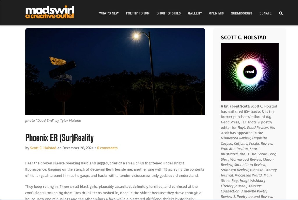 Mad Swirl was the last publication to publish anything of mine in 2024, a short story titled “Phoenix ER (Sur)Reality” on December 28, 2024. I’m very happy because Mad Swirl is one of my favorite magazines and because I’ve worked and worked and wrote and rewrote this piece and I like how it turned out and am glad someone else did too, so thanks dear Mad Swirl editors!