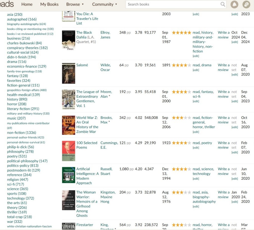 With that said, “naturally” I don’t have the time to do my usual commentary and analysis but I’m fucking determined not to let this drop so I’m linking to last year’s post for comparison purposes and then just posting a couple of screenshots of my 2024 results as well as the annual results from 2018 through the present. Goodreads seems to have made some radical changes to the interface and seems to have ripped 75% of the info available away but I guess I can’t do anything about it. I’m sorry this is so late and I doubt many may care at this point, but I had to do this for me at least. I can’t just break such a longstanding tradition so casually, you know?