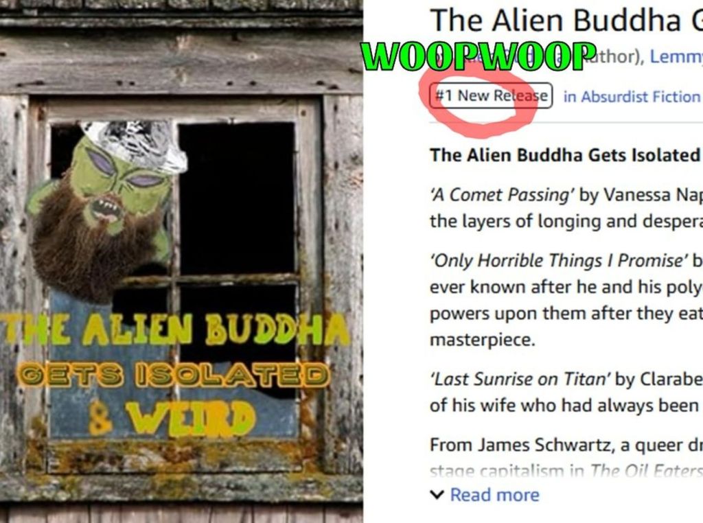 I recently posted that I had material in a giant new anthology called The Alien Buddha Gets Isolated and Weird, which was released a few weeks ago. I’ve been really swamped and forget to post the following. Even though I know the “secrets” to getting #1 books and best sellers on Amazon, which is great PR, sounds good and feels good for a day or two, I also know it’s a bit of a gimmick — that, and the many series everyone produces with lots of white space, huge font sizes, few pages, etc. But that said, with all of the many dozens of books with which I’ve been involved or a part of, I think this one may be the first time I can technically say “It’s #1” (in something). And that’s kind of cool to say and I’ll take it, even if it won’t last that long. But who knows, right?