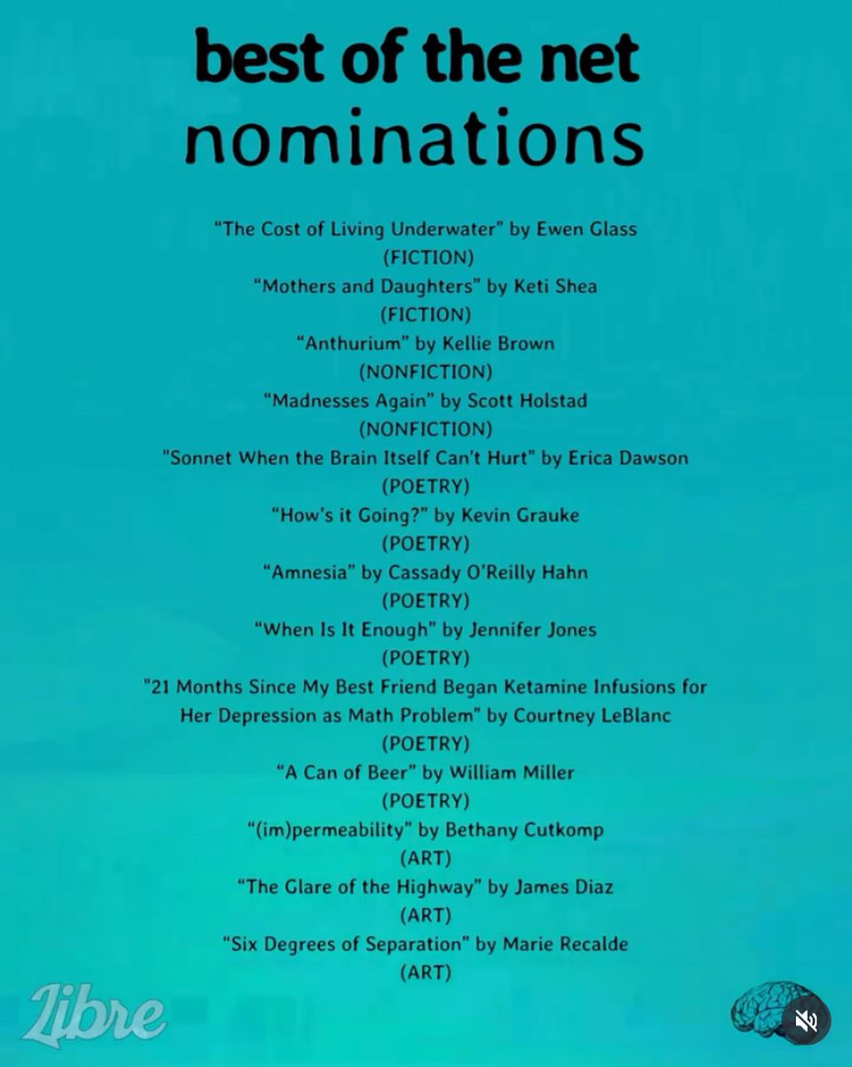 Many thanks to Libre for nominating me for 2026 Best of the Net in Nonfiction with my piece “Madnesses Again.” Special thanks to EIC Mary Sellers for working hard with me to make the piece as strong as possible. She’s a serious credit to her profession and put in some real time and effort, which is sort of old school — something I can respect.