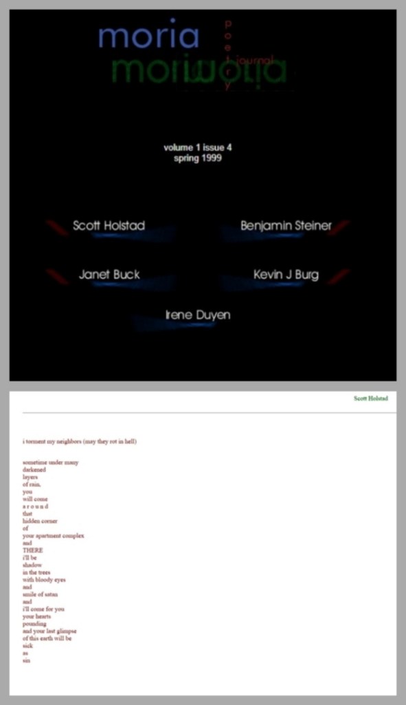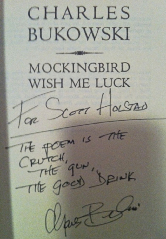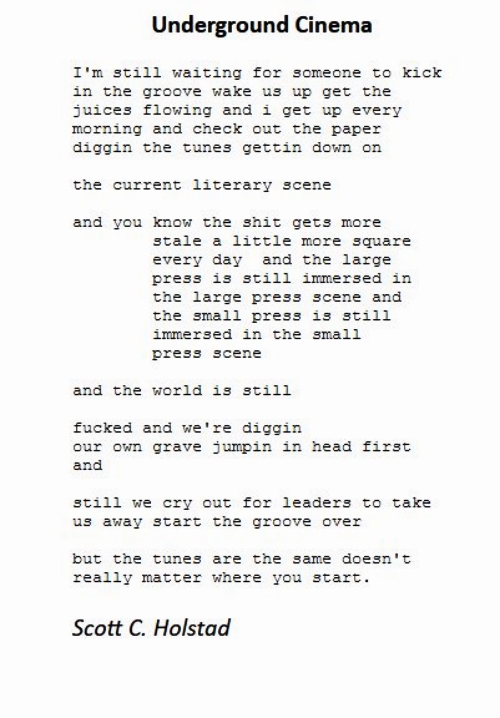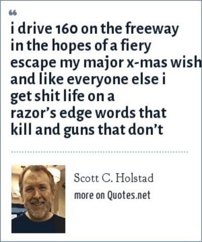 Readers have commented that they think this poem, “The Writer” (published in 2005) is very Bukowski-like in some ways and I suppose I have to agree, though that hadn’t been my intent. What I found ironic about those comments was early in my career, not only were specific stories and poems of mine compared to Bukowski, but entire poetry collections. And not just in the U.S. Such comparisons were made in a number of European publications, Canadian, Australian, etc., much of it sometime between 1990 and 1996. Then, those who know my work will recall that I somehow took a “vacation” (not a pleasant one) sometime after that and my writing reflected that in most of my books thereafter, as well as most of my poems. But at least it didn’t take an entire decade to get me out of that death zone, right? It was nice to get back to a healthier, funny old school Holstad theme and poem. And yes, this was just the latest in many poems like it, most all of which featured total crazies proposing “X” to me or promising me “Y” or suggesting “Z” to me — theoretically for free, as perceived favors. And chances were I blew some opportunities as I walked out on most. But most of the time either my bullshit meter was screaming hard cause they were FOS and I knew it or my crazy meter was going off since some of them believed their own bullshit. And like much of my stuff back then, these were all true, happened, and yeah, I walked most every time. Regrets? Almost never. Some early similar poems involved this coked up young guy in Phoenix who became a fanboy, was into industrial music like me, claimed he knew Al and Paul of Ministry, he had sent Al a copy of my first book which Al, naturally of course liked, and that they wanted to meet me in L.A. (not Chicago?) to discuss possibilities of adapting some of those and other poems into lyrics for an upcoming album. Which sounded like one of the biggest piles of shit I’d ever heard. I knew people who DID know Al and while Al collaborated with people, they tended to be certain people with certain bands and as far as I knew, not via a manner such as this. The only thing that made me pause was that – believe it or not — some of my poems and other works had actually been adapted into musical and mixed media projects, so for instance a major alt fashion show in Phoenix was done with the models prancing down the runway to BPM imbued with Holstad-written AND narrated poems and spoken word. I’d also been asked to do this experiment in Atlanta’s biggest and hottest club where I’d originally been invited to open for this very popular British band in the States for a six week tour, but some genius got the brilliant idea that the band and I should meet ONE time — the day of the show — and work out some experimental Bill Burroughs-inspired mixture of me reading my work via cut up method WHILE the actual FAMOUS band tried to integrate their music in a marriage of hell with me. Fucking nightmare, swore off those types of experiments after that. But moving on, … TBC…