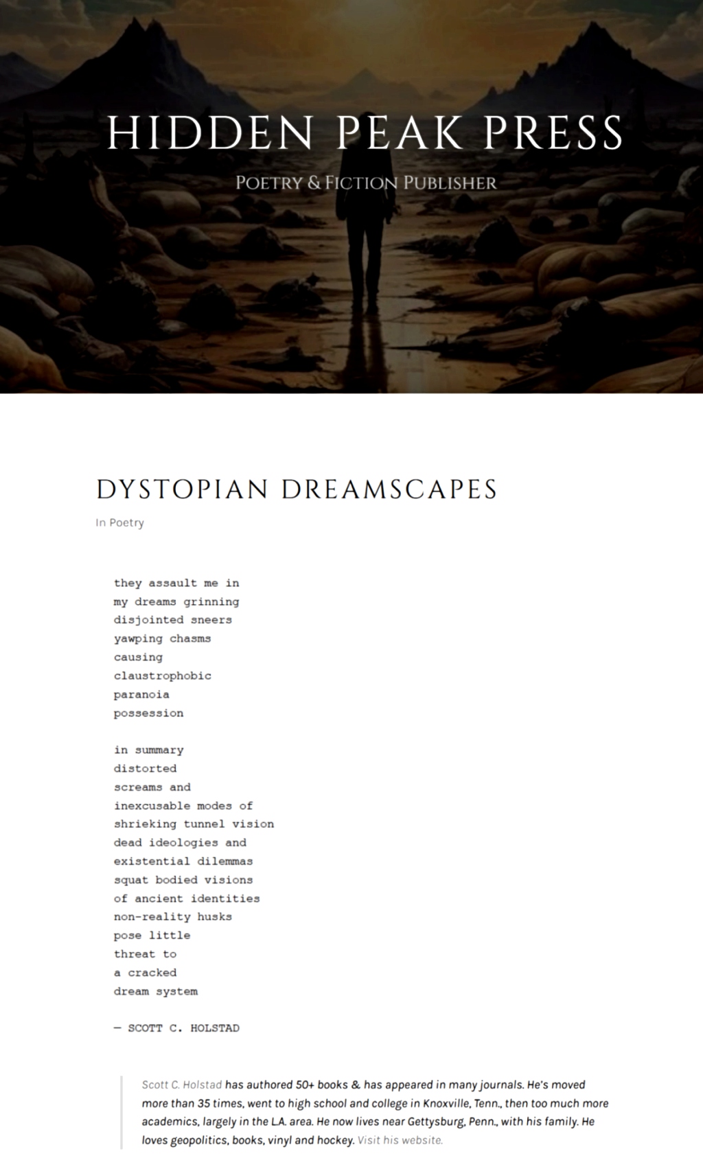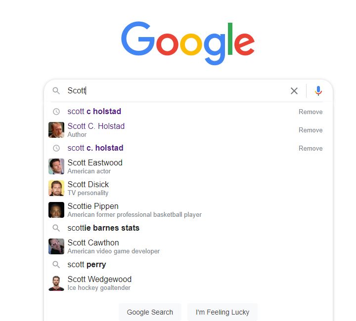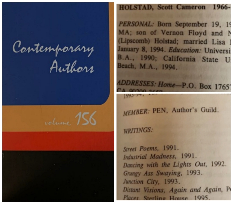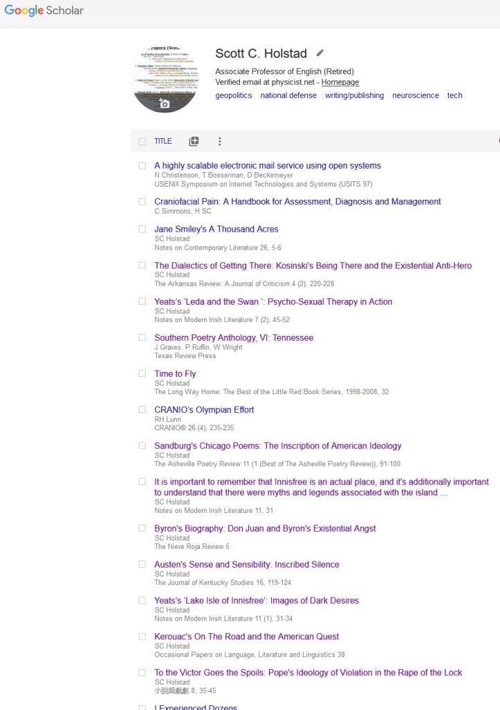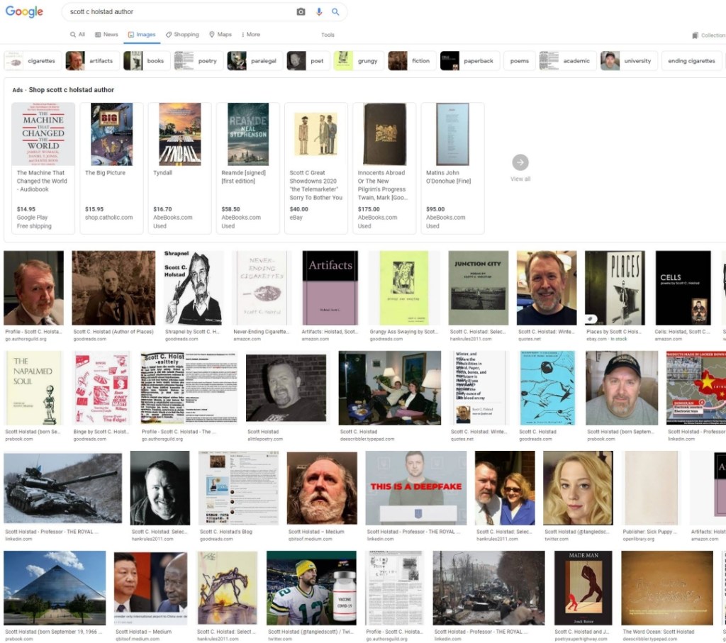 After 3 decades as a professional writer, Scott C. Holstad now automatically displays “Scott C. Holstad, Author” with a thumbnail image of his face while conducting various searches with Google Search. Then when one chooses any of several possible results for “Scott C Holstad Author” (including “Scott Holstad,” “Scott Holstad Poet,” “Scott Holstad Writer,” “Scott C Holstad Scholar” and other related search strings — which can change periodically with no warning as specific search strings alter results), Google Search results display a profile Google provides on top of and to the side of the results with, as of late March 2022, my name, “title” assigned to me (“Author.” It was previously “Writer.”), a thumbnail headshot above the results and to the side an “About” section featuring a bio taken from various sources (in this case from my Authors Guild profile) as well as ever-changing info such as birth & marriage info and icons for various social media “Profiles” all of which link to those profiles, such as Google Scholar, Twitter, LinkedIn, et cetera. All of which may appear in different form and content, or not at all, depending on both search string used and most common current searches being used because less frequent searches will reduce this information, scale it back, or it will simply disappear from other results. Conversely, these can grow seemingly endlessly with more info on you and both more frequent searches for you and obviously the higher a profile one has. Thus a search for Lawrence Ferlinghetti displays info about his spouse, children, education, some photos of some of his books, pictures and names of others people searched for, et cetera.