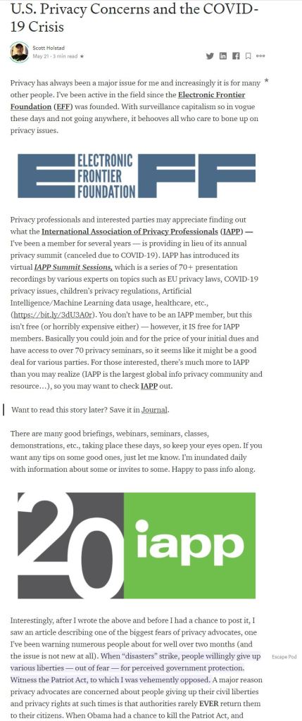 An article by Scott C. Holstad about privacy during the COVID-19 pandemic published in Noteworthy, May 2020