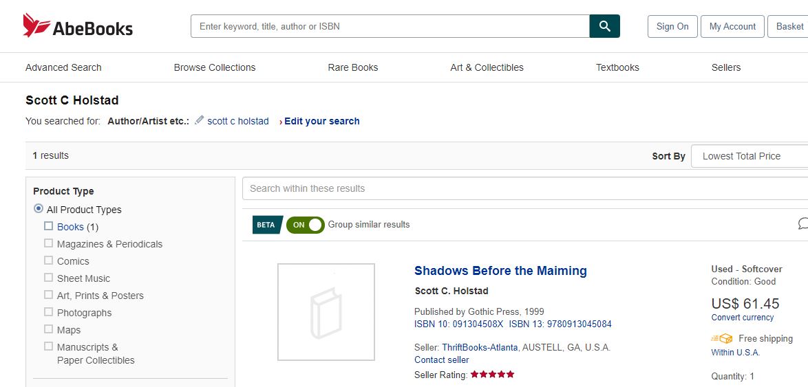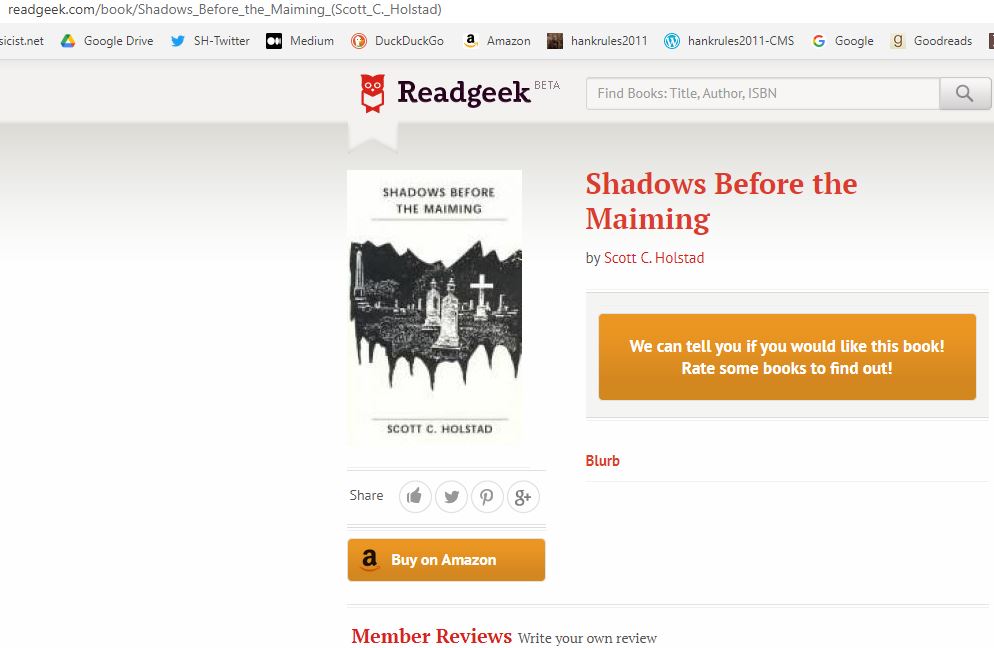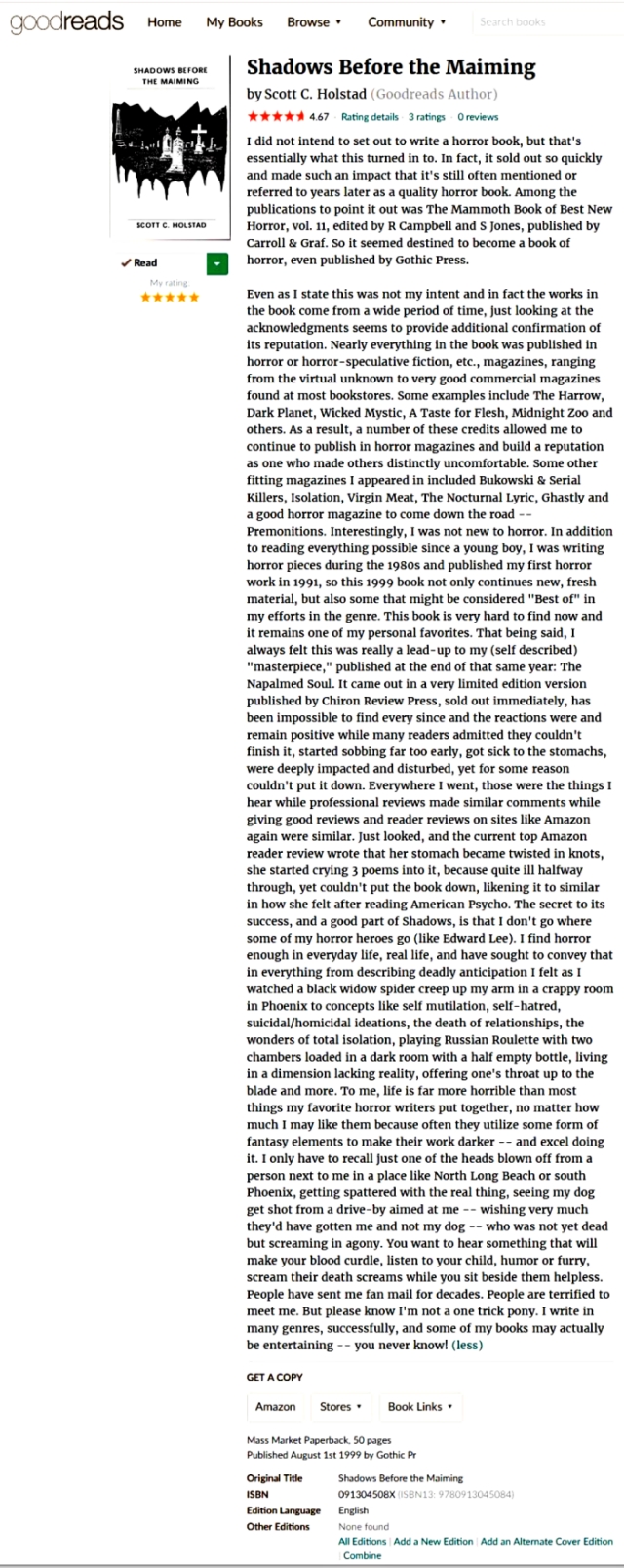 By the way, if anyone is interested, yes, the default search results differ so that if one were to type in the exact same search string as Google — “Scott C Holstad Author,” Bing’s display is very different (not to say the order of the results). In this case, a row of books appears at the top — none of which are Scott C. Holstad’s — followed by a search result providing a brief bio, but from a dubious source which then begs the question of accuracy, followed by results from Goodreads (two) and the Authors Guild while beneath them is a row of pics labeled “Images of Scott C Holstad Author.” To the right of the results is a small bio and photo similar to Google’s but from a different source, in this case my Amazon Author page.