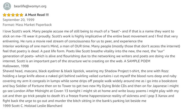 And this type of result is always changing based on these and more variables. My display formerly including a section listing some of my formal education, often derived from sources like Wikidata. This information and these sources don’t disappear. Google’s algorithms are designed to change with the tiniest search patterns. Thus as one can see from the Google Search Results screenshot beside this text, photos of Scott C. Holstad from any resulting source that may have any are now displayed beside the result, so in this case my photo appears alongside results that include my Poets & Writers directory profile, a literary publication’s website, my Goodreads Author profile and oddly, an ancient picture from the apartment of an old friend’s blog. But what if one wanted search results that displayed pics of some Holstad books, like Ferlinghetti’s does (or a row of author photos, etc.)? Well, it depends on the search inquiry.
