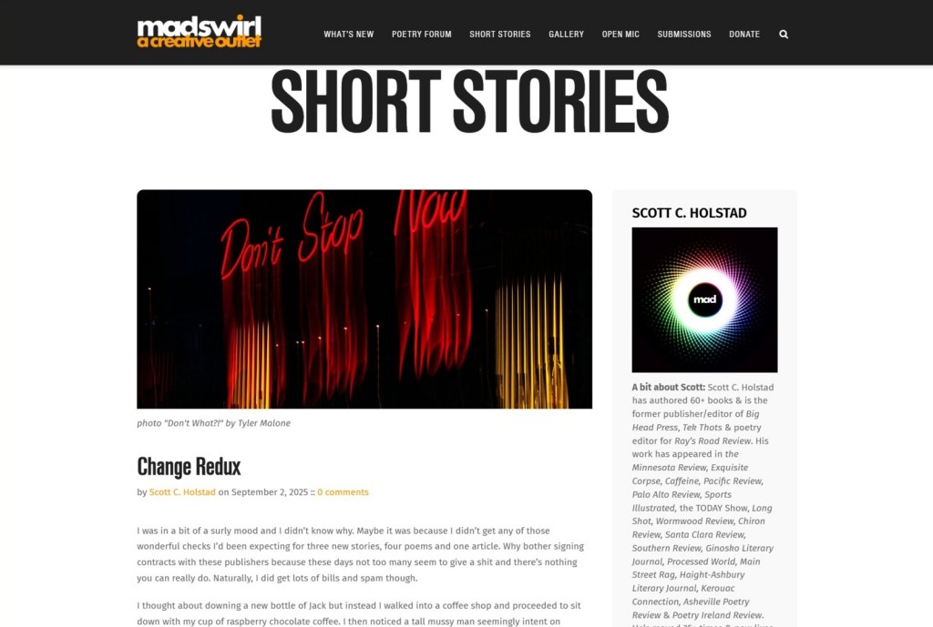 It seems like I’ve taken a long break from posting anything here, nothing of my renewed journey in writing over the past couple of years and while there are many reasons for that, I’m older, have substantial health issues and have really slowed down — literally — but my writing journey continues to stay in pretty good shape so I’ve not had or taken time to think of how best to update this page, but I think I’m just going to kick-start things by posting pics of recent publications or pics of some of the pubs (so photos of magazine and anthology covers and/or pics of actual pieces I’ve had published…). That’s what I’m going to initially try to do. Thanks for hanging around!